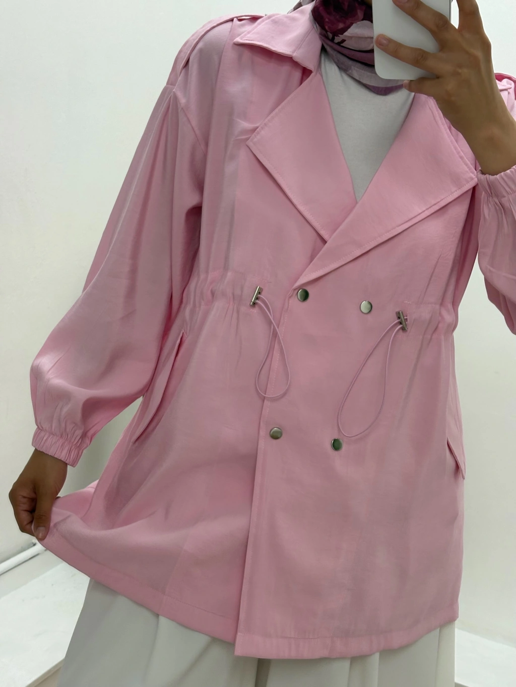 Bu pudra pembe trençkot, zarif görünümüyle hem günlük kombinlerde hem özel günlerde fark yaratır. Orta kalınlıktaki kumaşı sayesinde mevsim geçişlerinde konforlu kullanım sağlar. Bel kısmındaki ayarlanabilir büzgü detayı vücut formuna uyum sağlar ve şıklığı ön plana çıkarır.