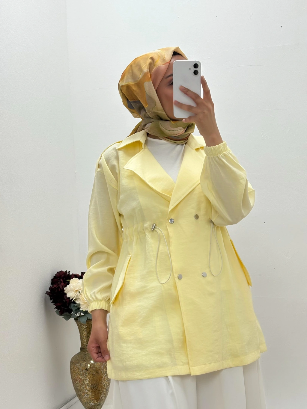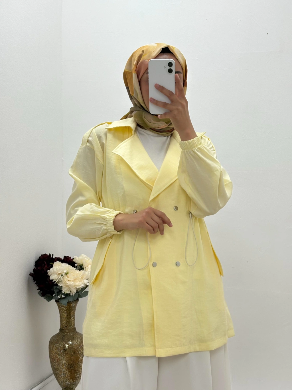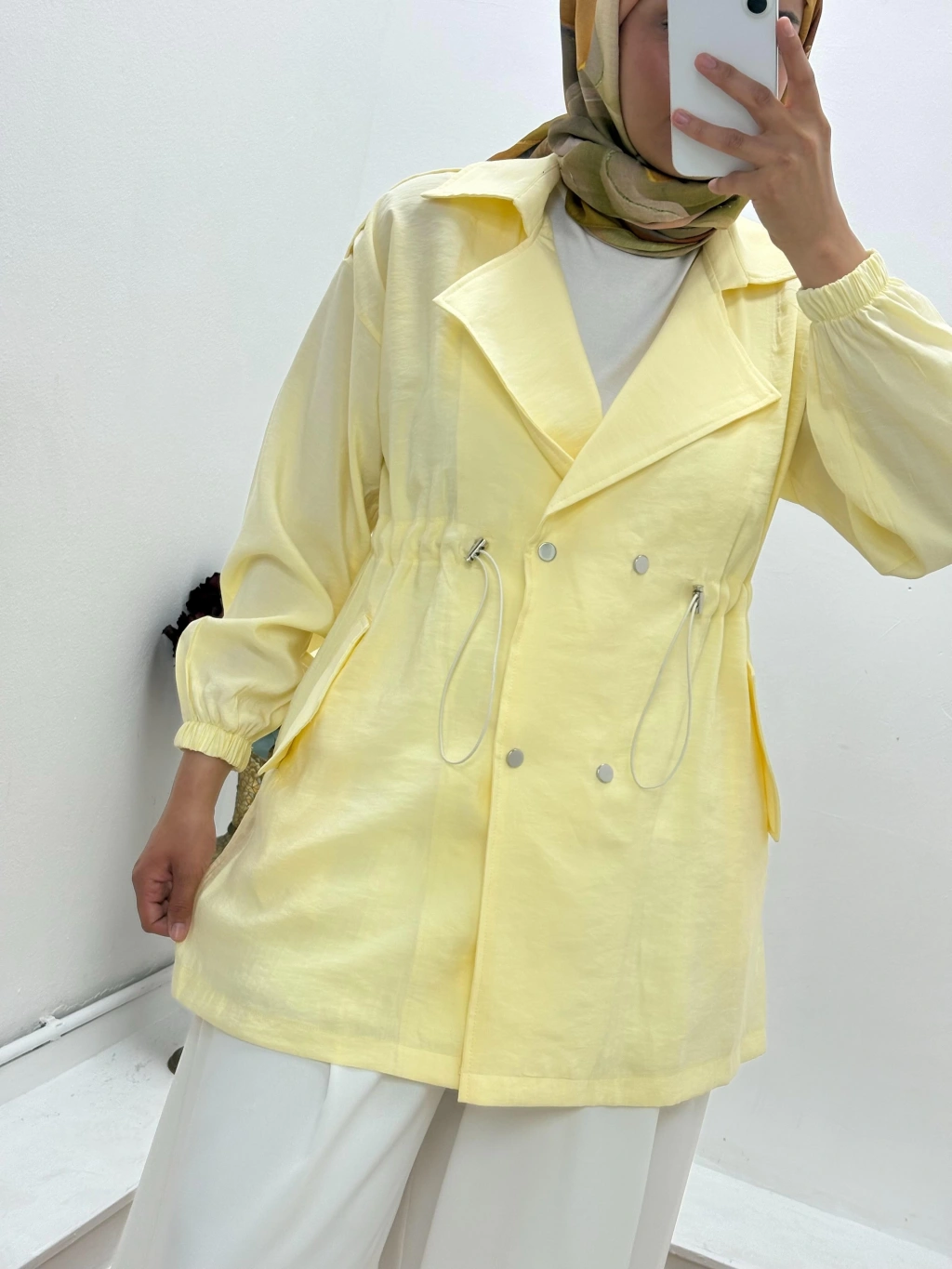 •    Model: Çift düğmeli, kuşaklı ve büzgülü detaylı