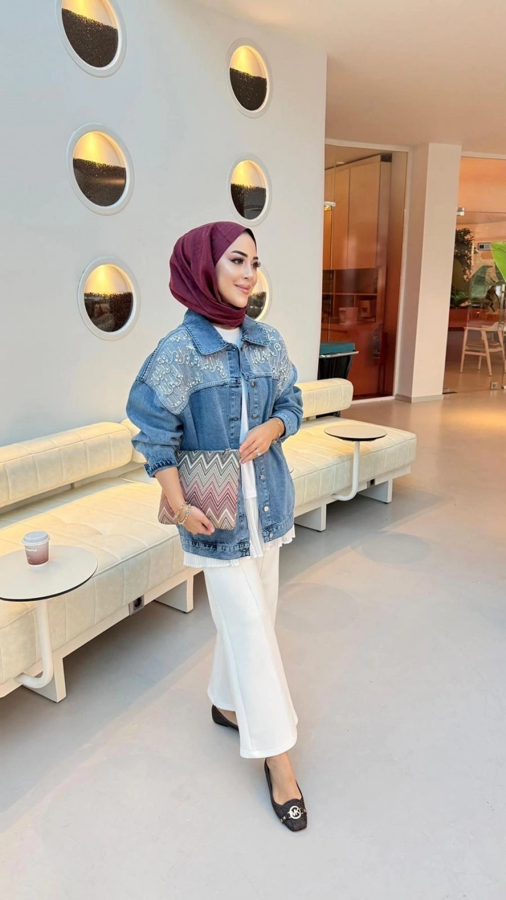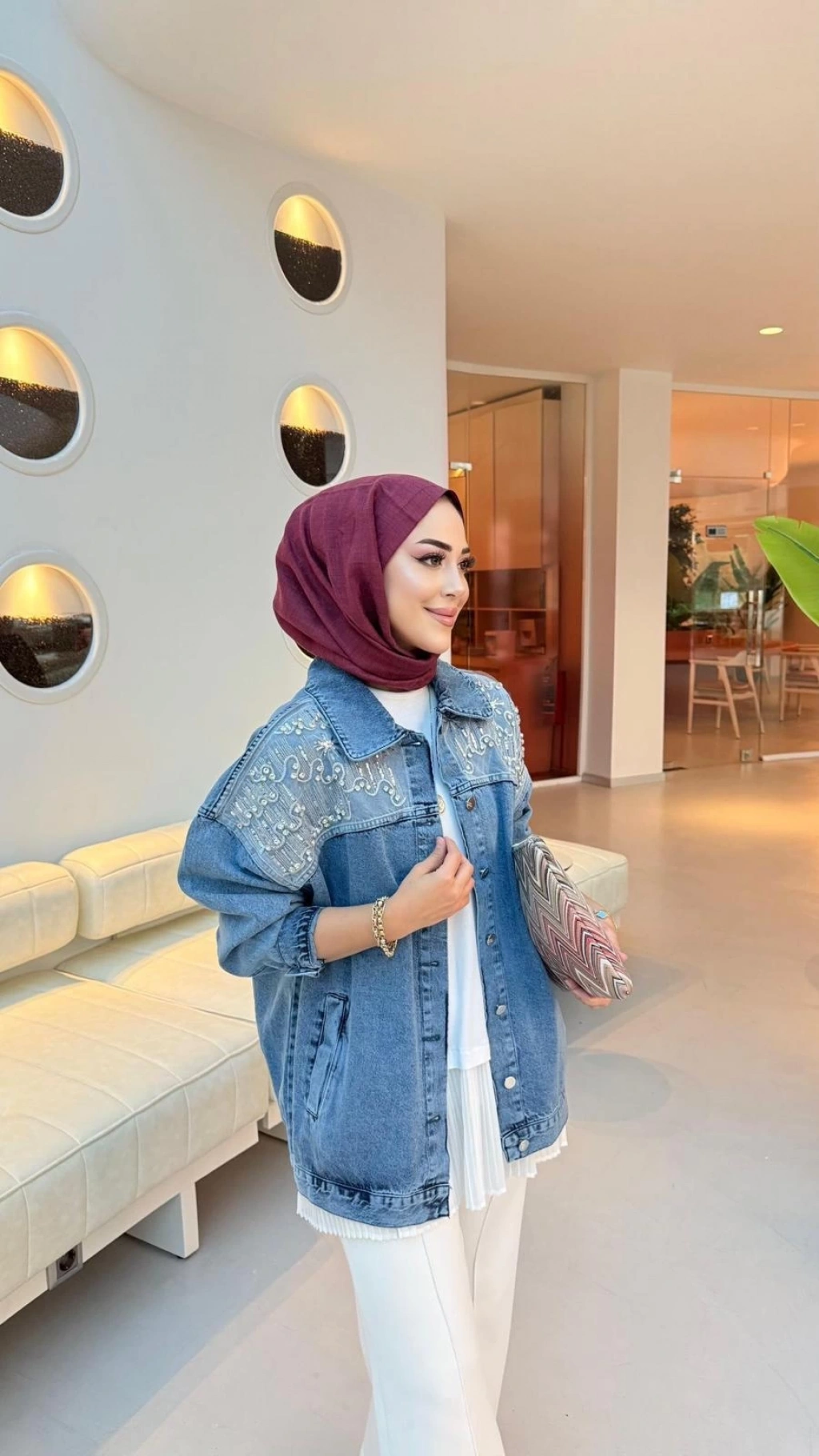 Omuz ve üst göğüs kısmındaki inci ve taş detaylı işlemeler, feminen bir ışıltı katarken denim kumaşın rahatlığı günlük kullanıma uygundur.