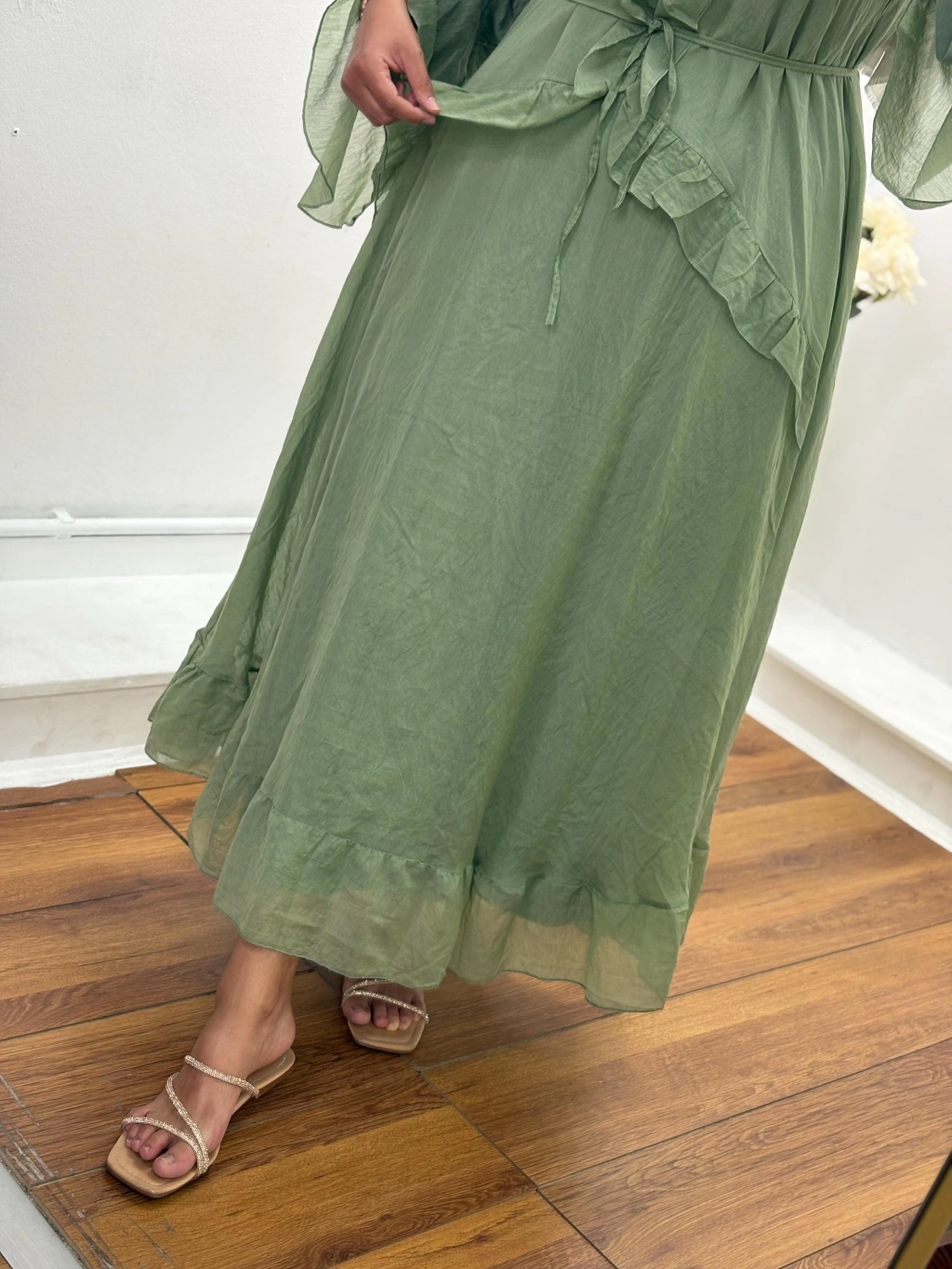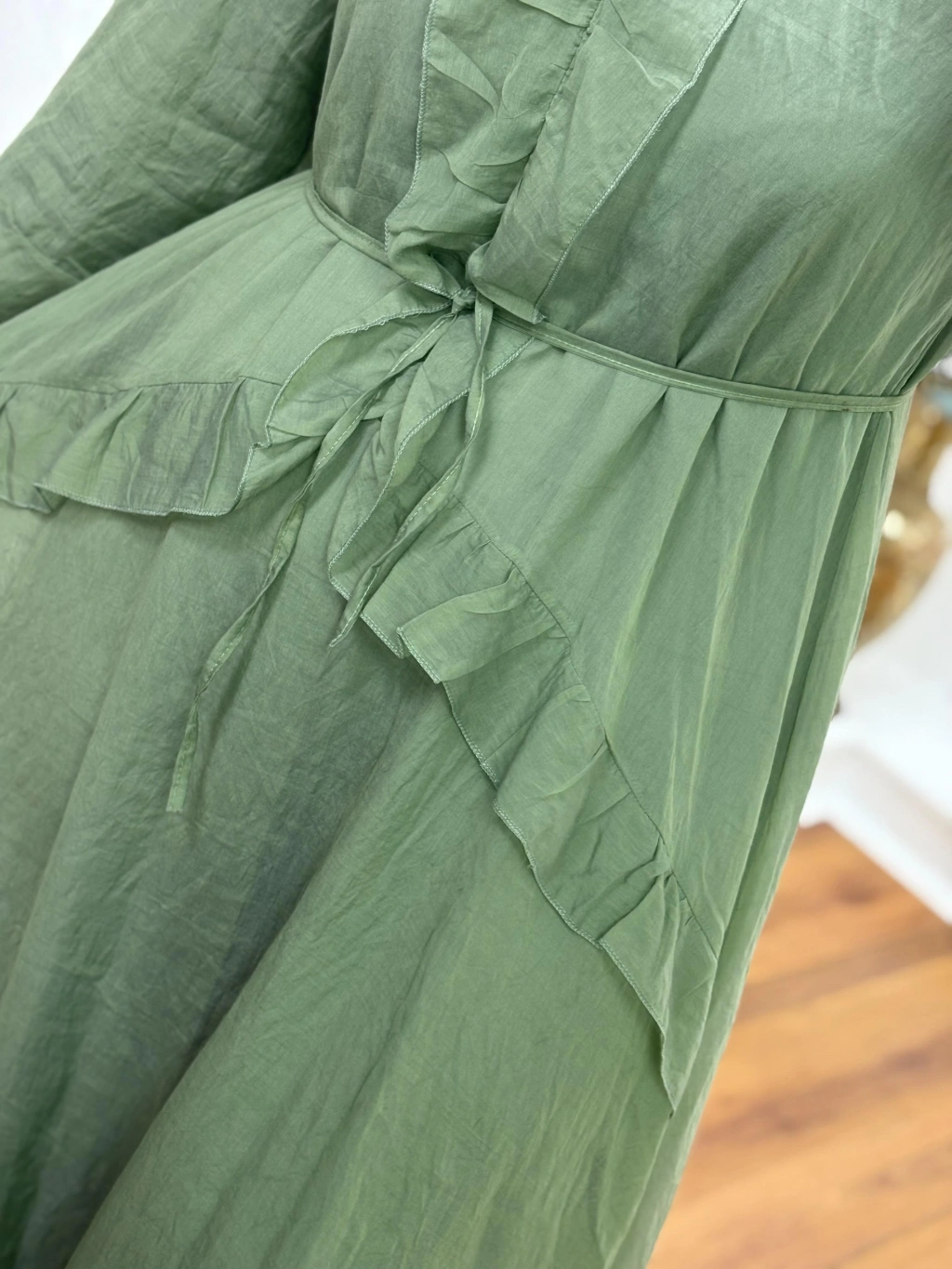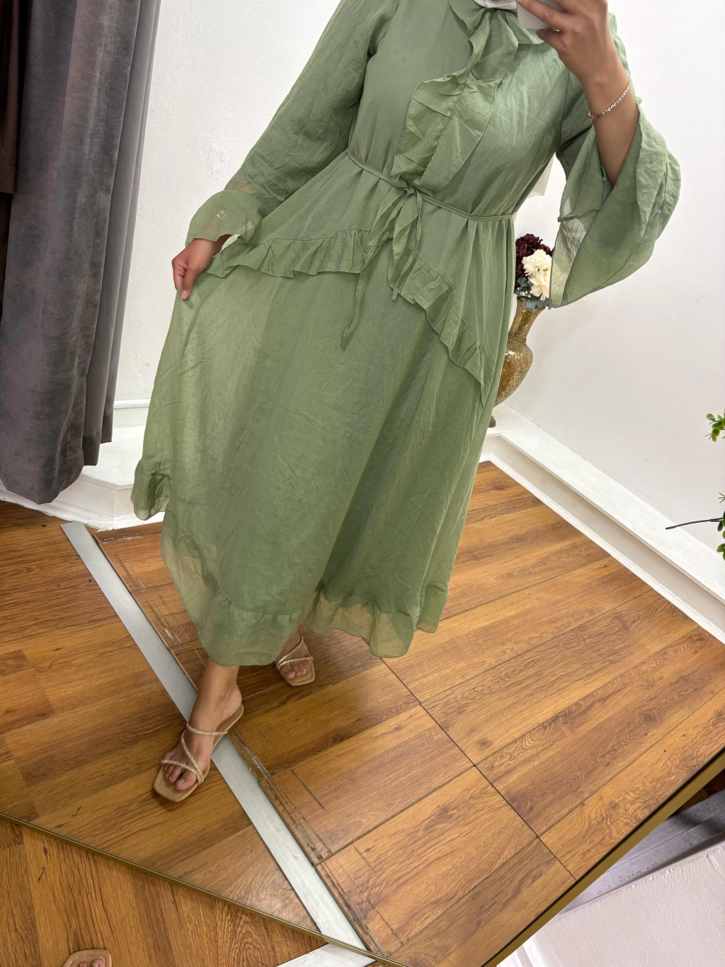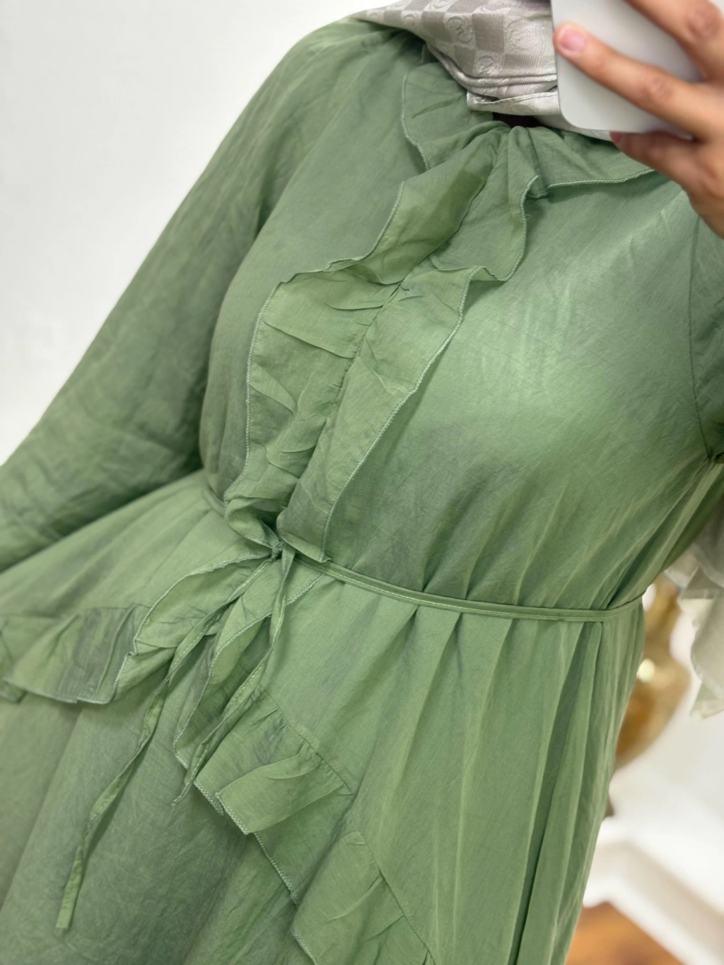 Doğallığın ve zarafetin buluştuğu bu mint yeşili şifon elbise, sade ama etkileyici bir görünüm arayanlar için özel olarak tasarlandı. Hafif dokusu ve dökümlü yapısı sayesinde gün boyu rahat bir kullanım sunarken, volanlı detayları ve belden bağlamalı tasarımıyla feminen bir siluet oluşturur.