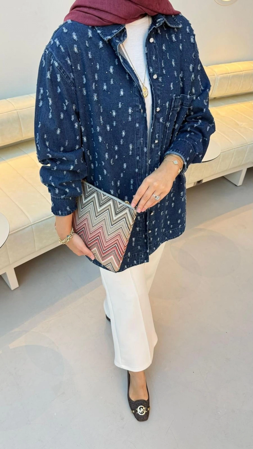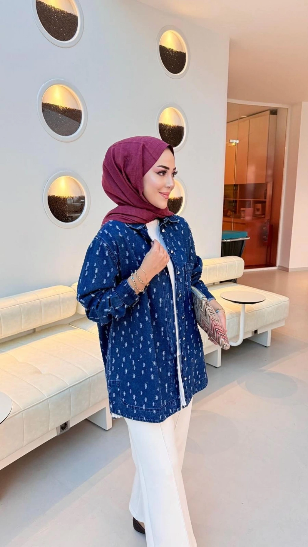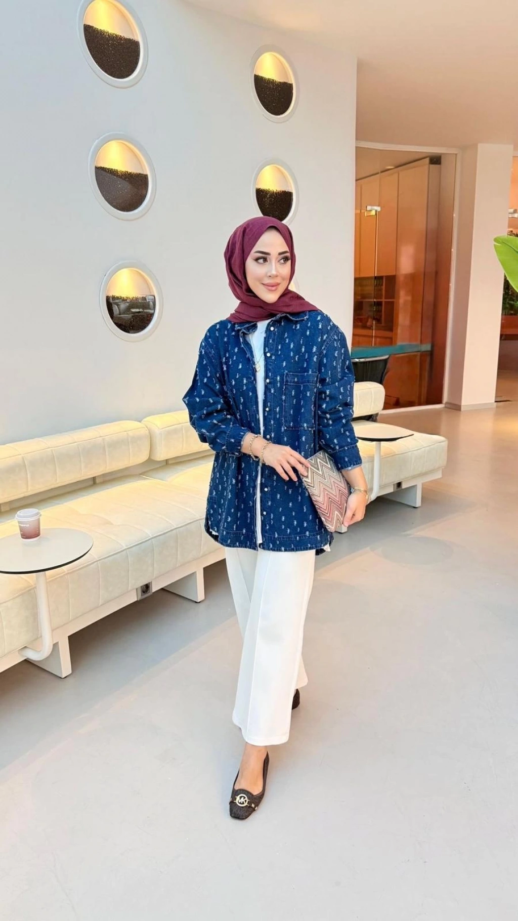 Yumuşak dokulu denim kumaşı, nefes alan yapısı ve salaş formu sayesinde gün boyu rahatlık sunar. Üzerindeki minik işlemeler, klasik denim görünümüne zarif bir dokunuş katar. Düğmeli ön kapanış ve göğüs cebindeki minimal detaylar, ceketi hem işlevsel hem de modern hale getirir. Beyaz, bej, bordo veya pastel tonlarla kolayca kombinlenebilir.