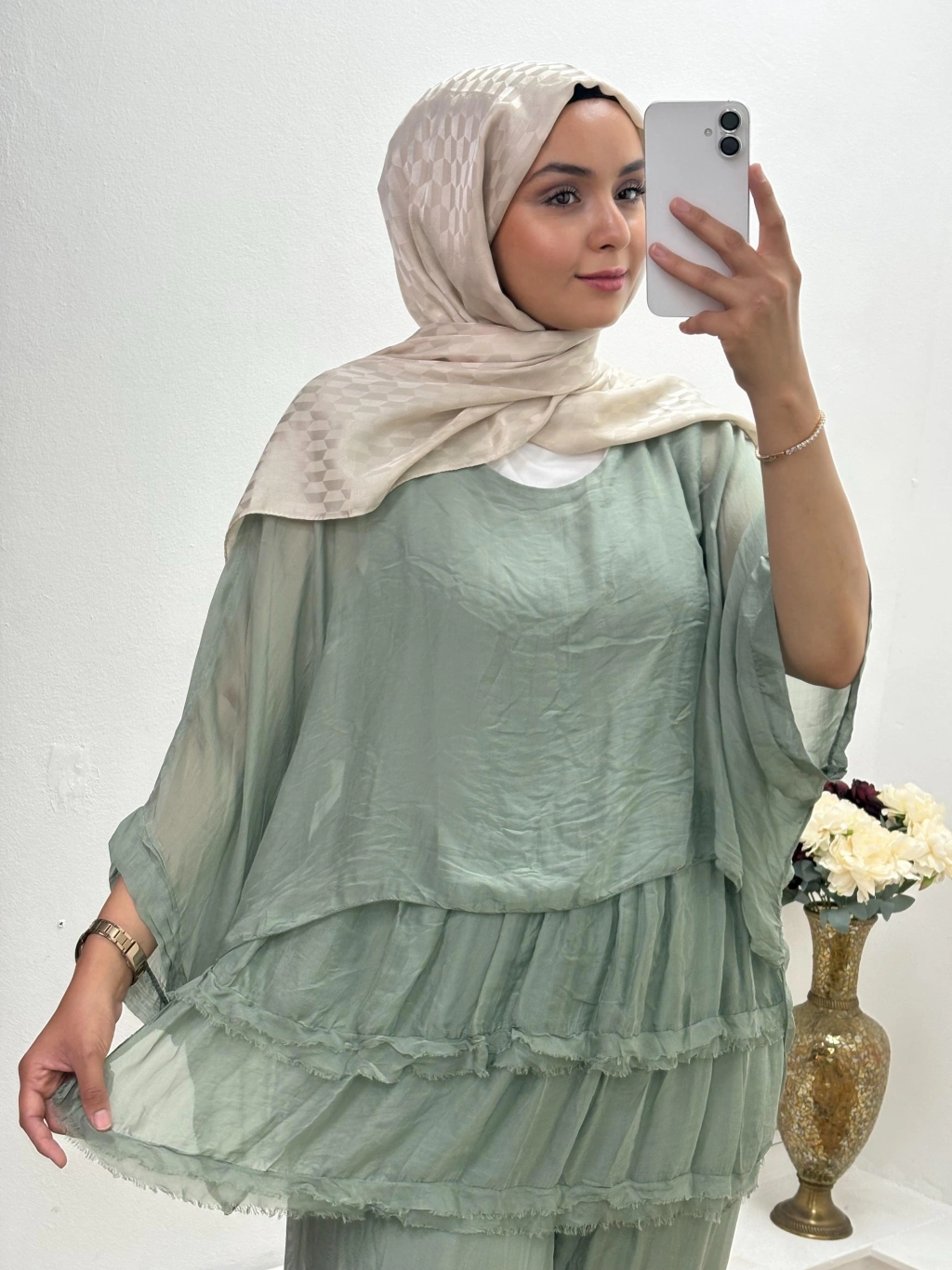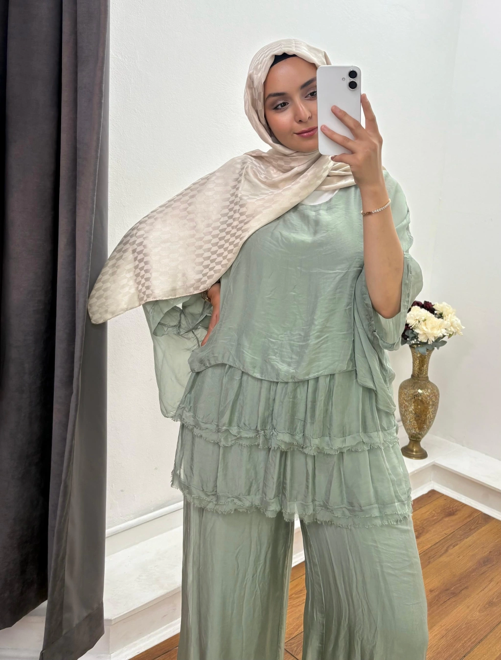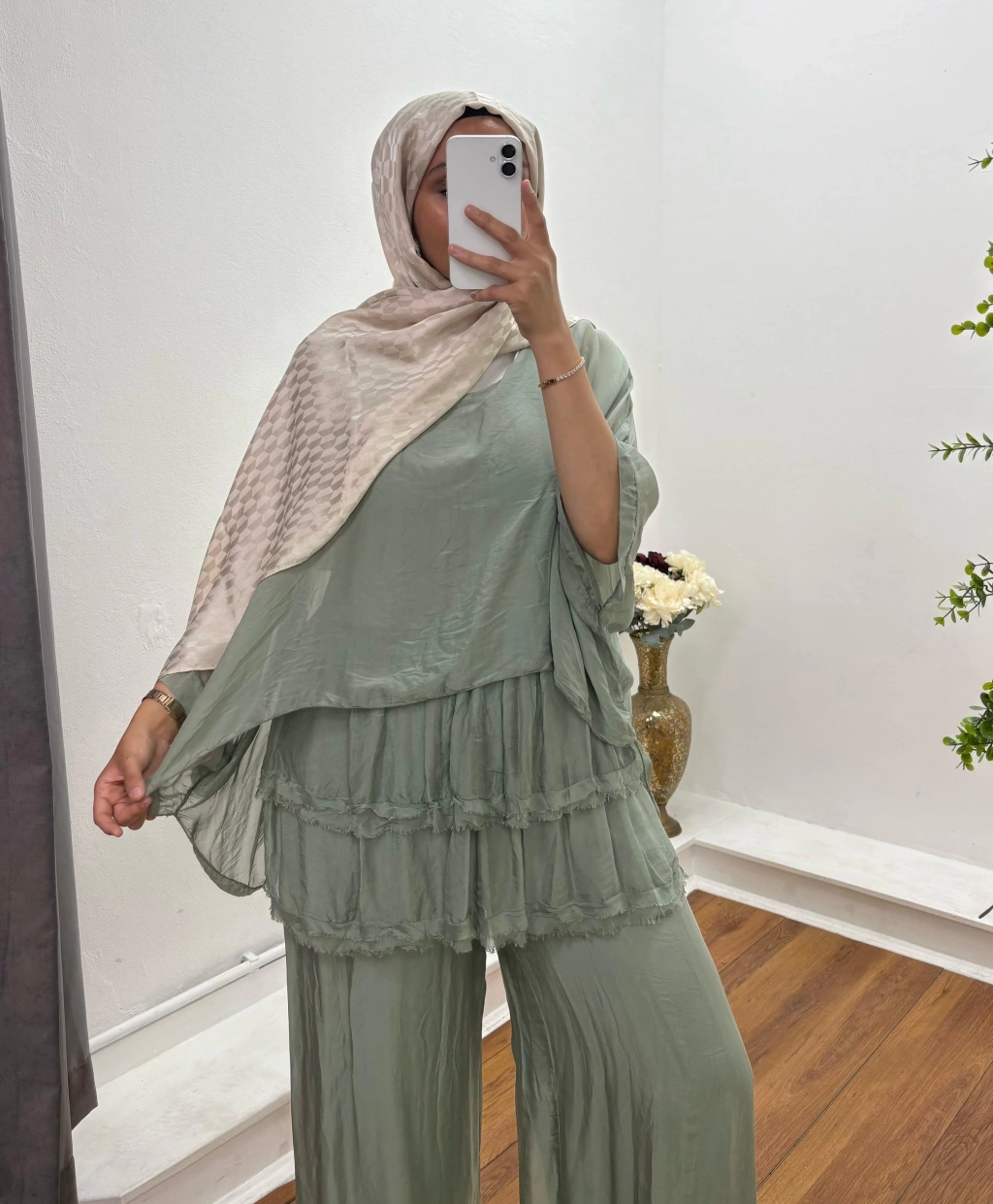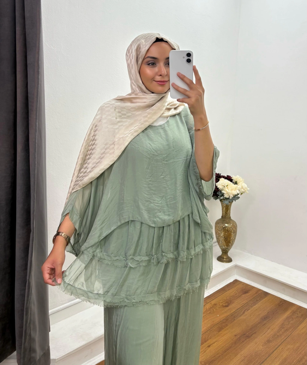 Şifon dokunun doğal dökümlülüğüyle tasarlanan bu su yeşili takım, kat kat volan detaylarıyla feminen bir zarafet sunuyor. Ferah kumaş yapısı sayesinde özellikle bahar ve yaz aylarında konforlu bir kullanım sağlar. Salaş kesimiyle vücut hatlarını belli etmez, zarif bir duruş kazandırır.