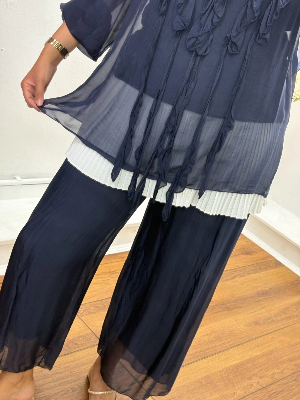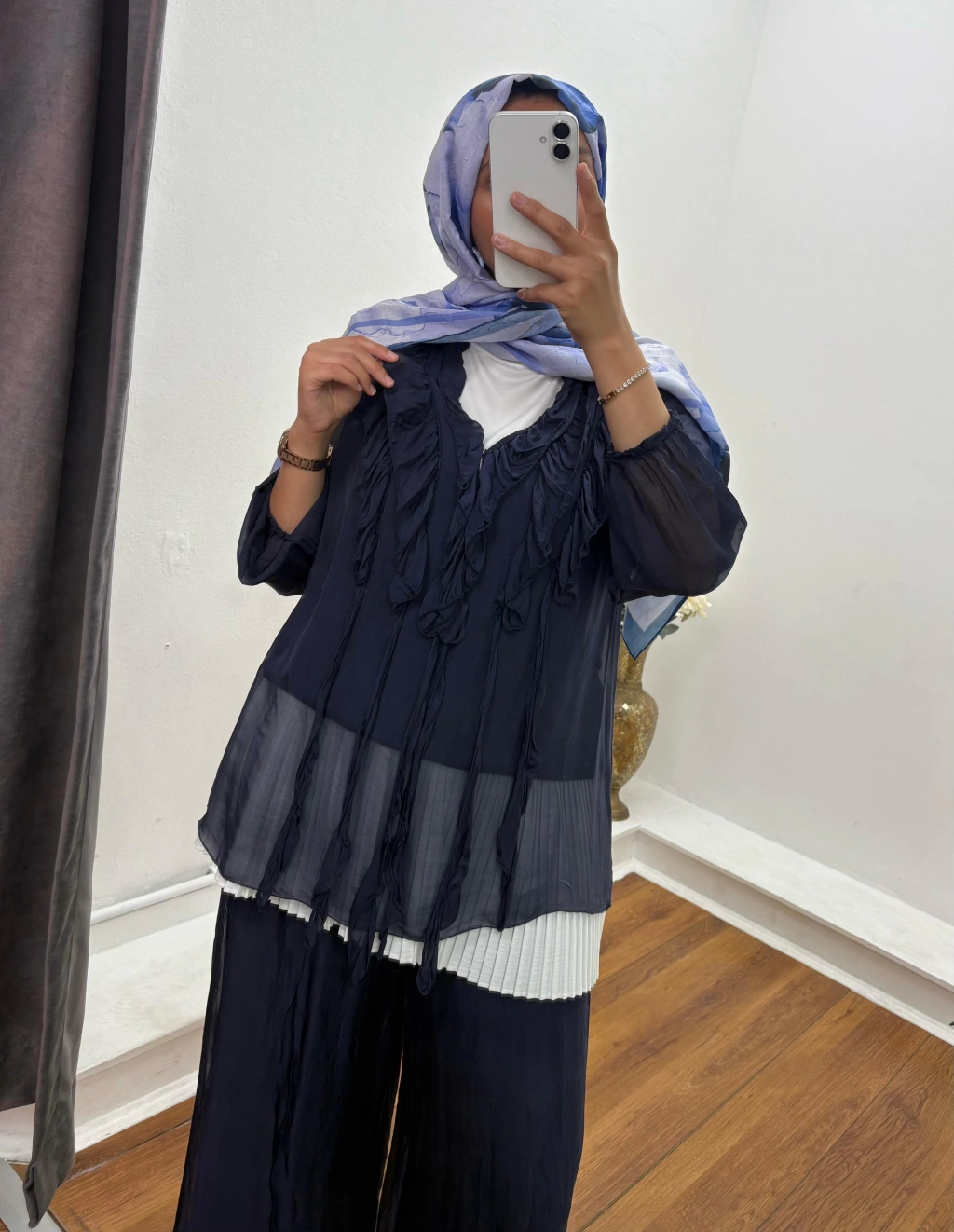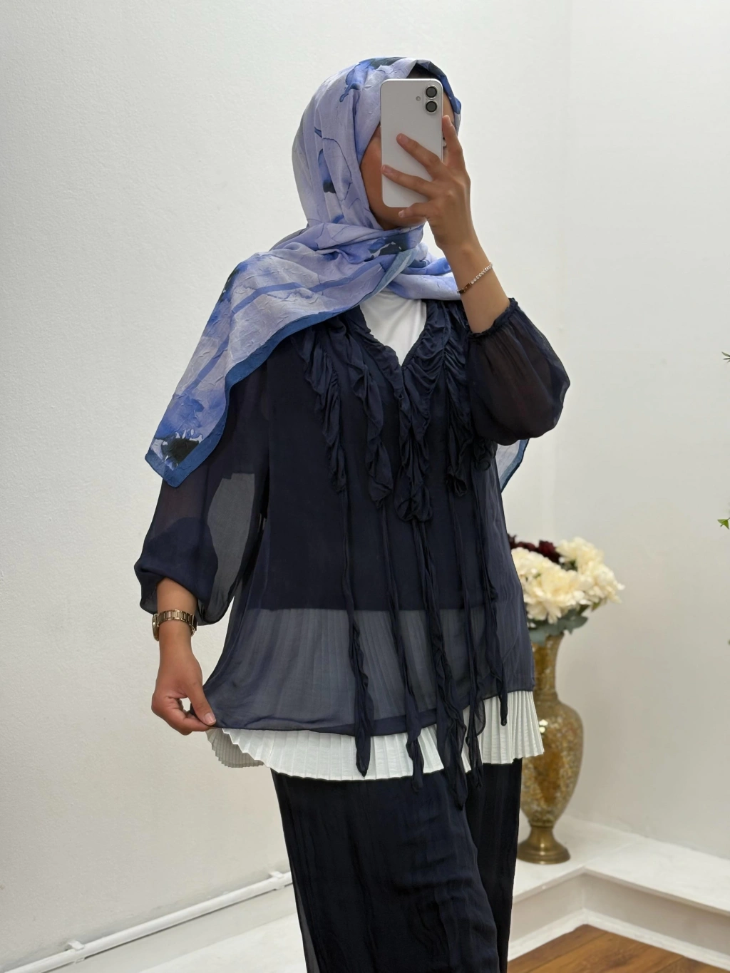 Şifon dokusunun hafifliğiyle tasarlanan bu takım, fırfır detaylarıyla romantik bir şıklık sunuyor. Su yeşilinin huzur veren tonuyla birleşen dökümlü formu, gün boyu rahat bir kullanım sağlarken, iç astar detayıyla konforu da ön planda tutar.
