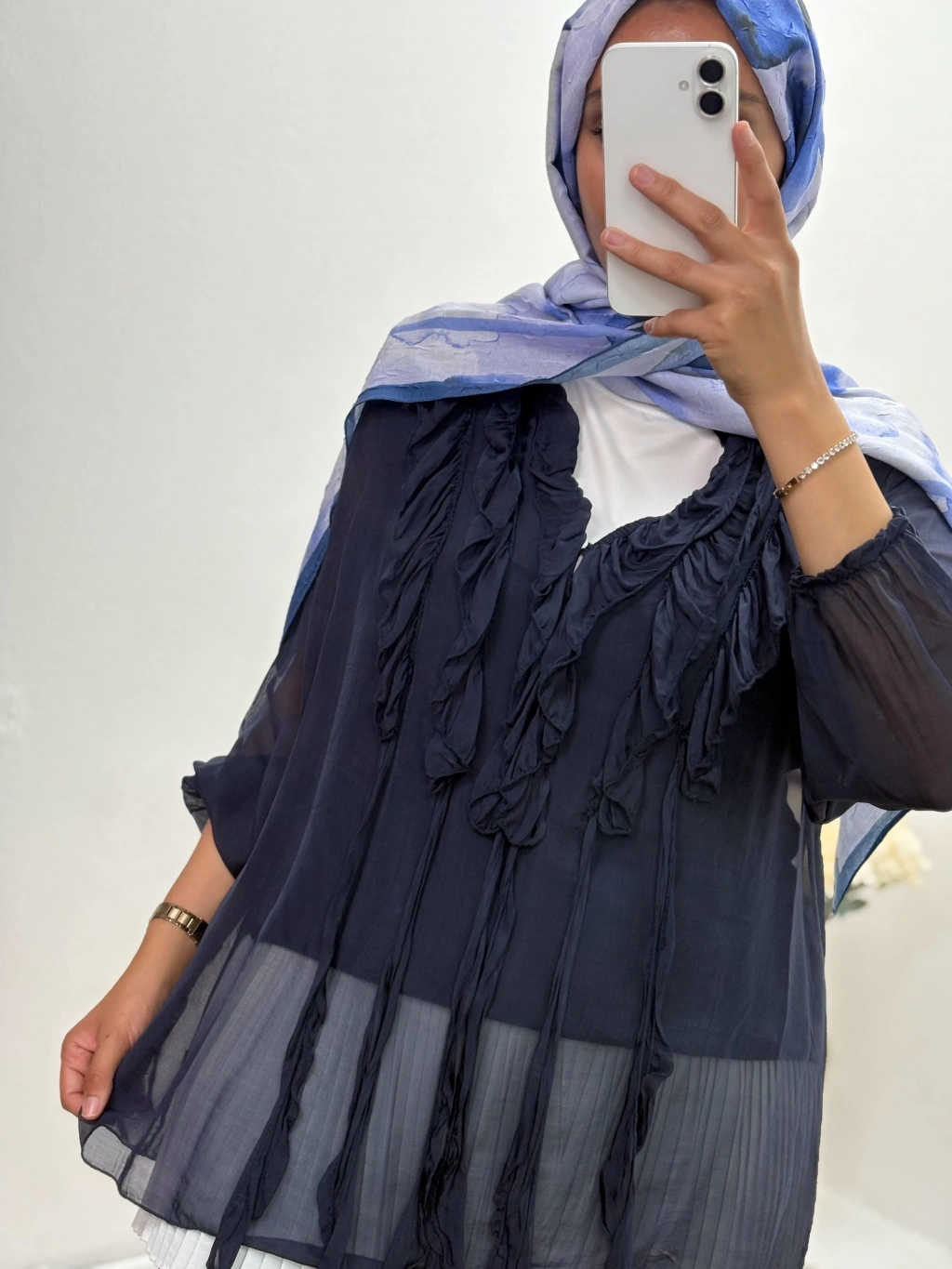 • Üst: Fırfır ve büzgü detaylı, balon kol, bileği lastikli