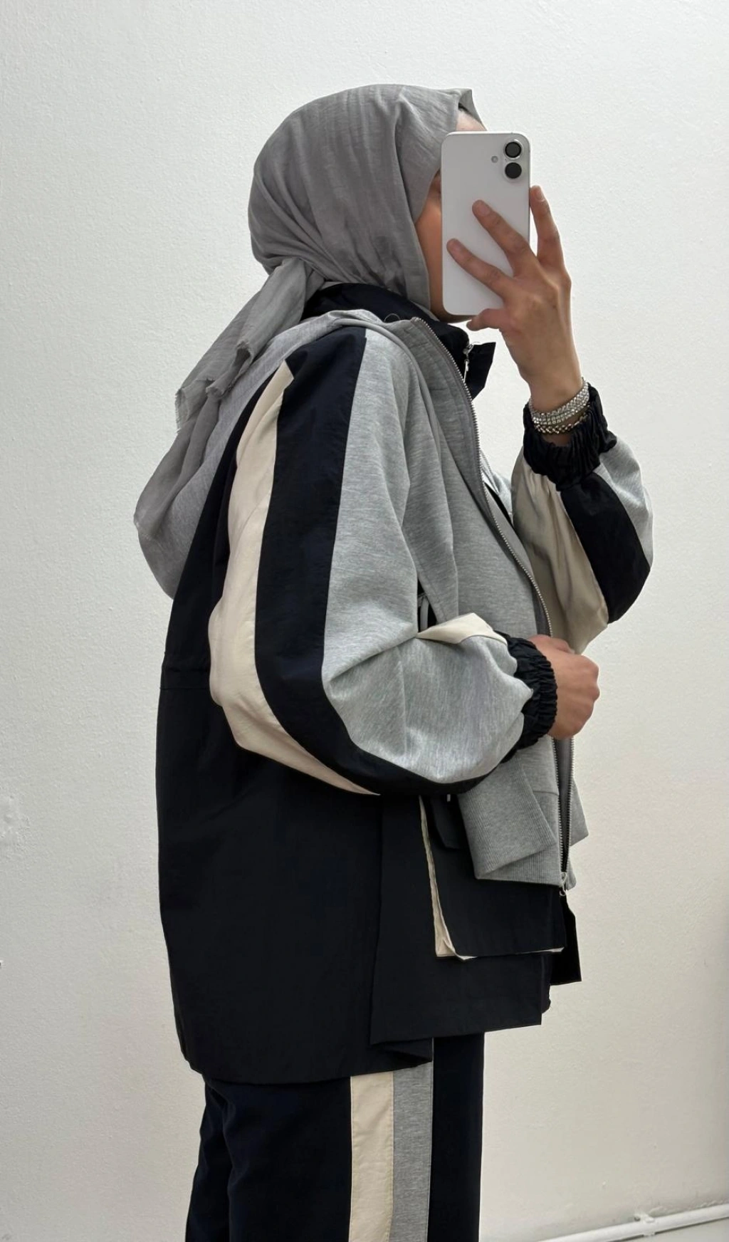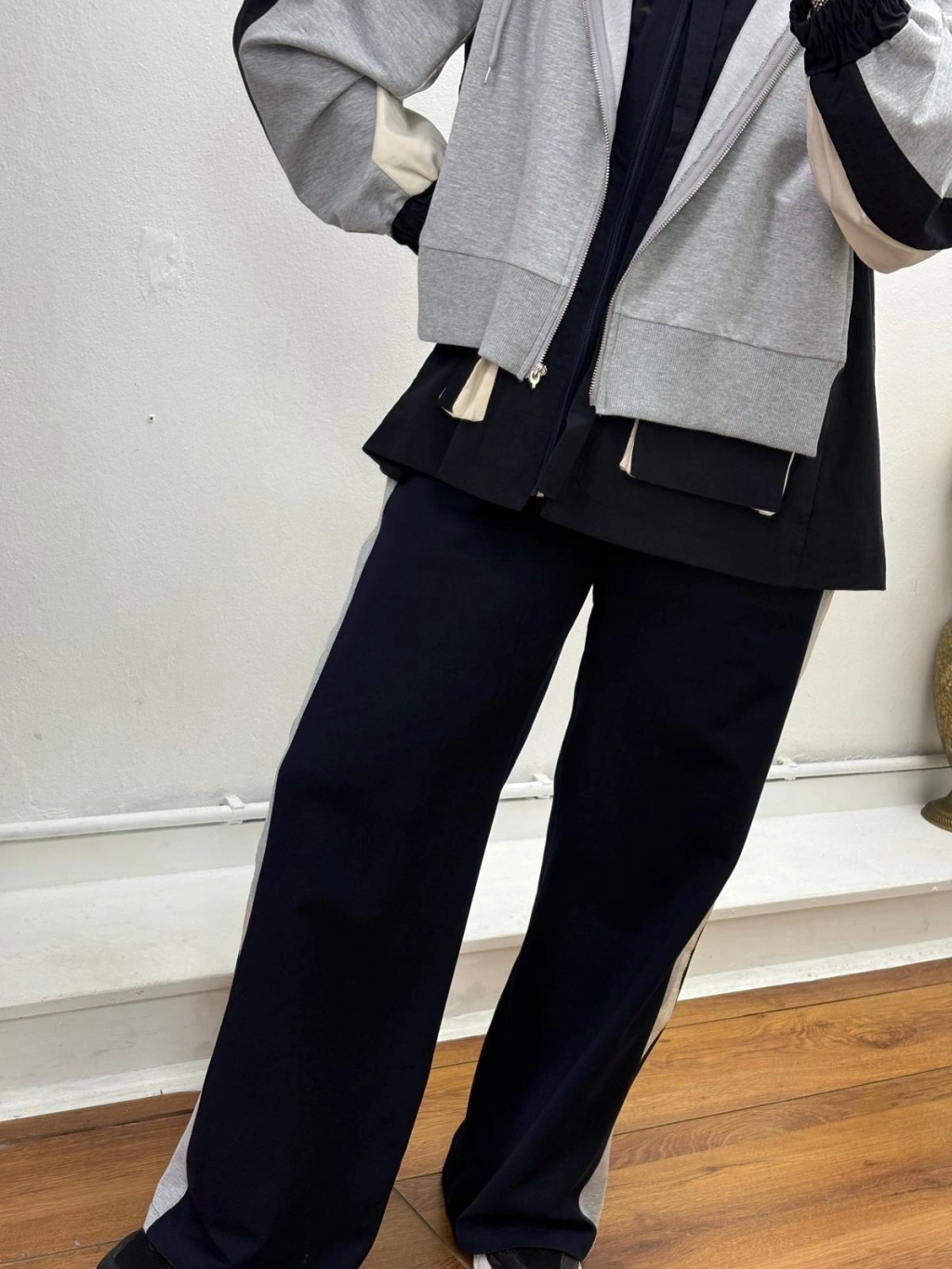 Kapüşonlu Şerit Detaylı Spor Takım Gri