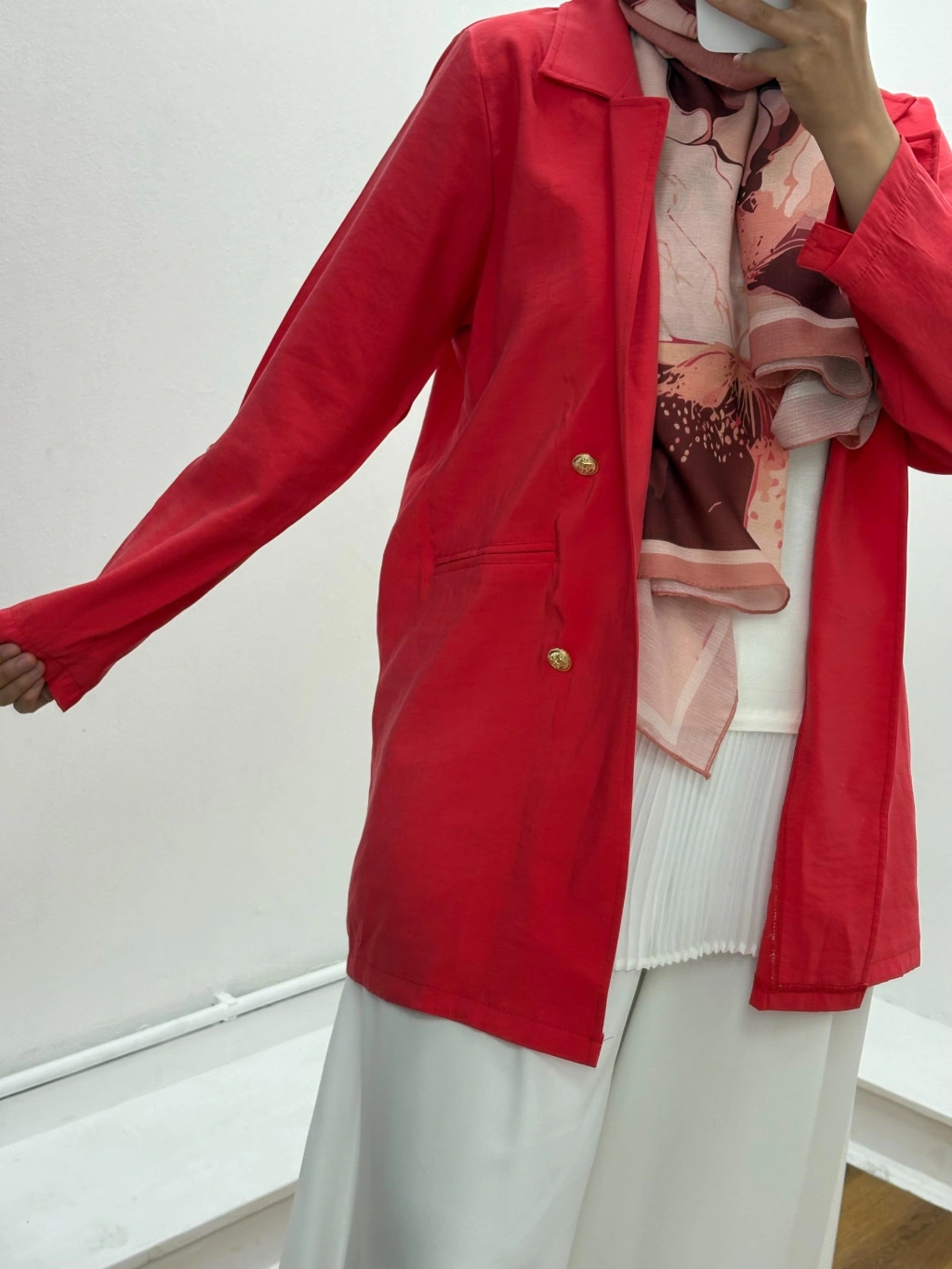 Yumuşak dokusu ve pastel tonuyla zarafeti yansıtan bu pembe ceket, sade çizgileriyle günlük şıklığın vazgeçilmezi. Hafif ve nefes alan kumaşı sayesinde mevsim geçişlerinde konforlu kullanım sağlar. Gold düğme detaylarıyla modern bir duruş sunarken, rahat kesimiyle her bedene uyum sağlar.