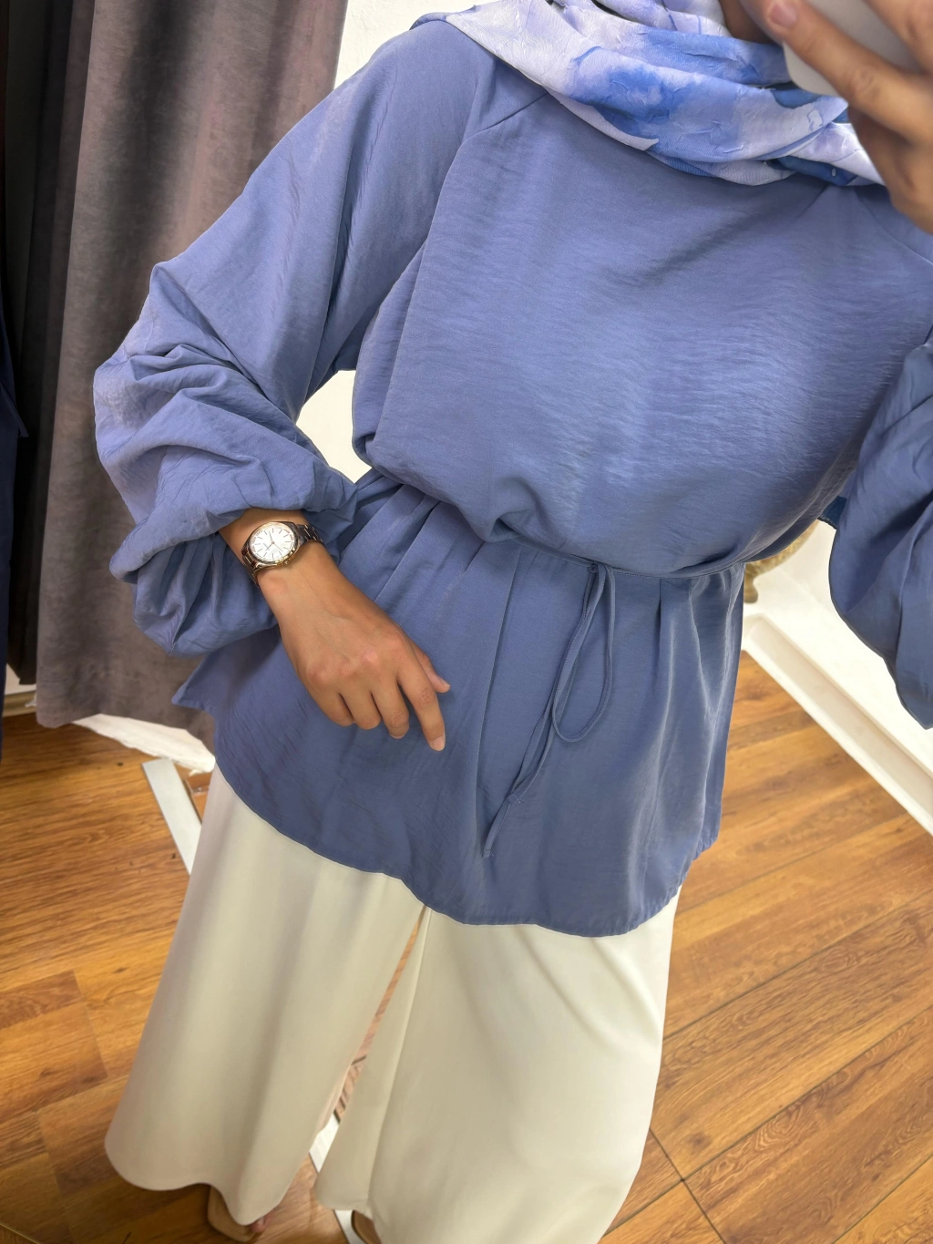 ? Mavi Kuşaklı Balloon Kol Bluz