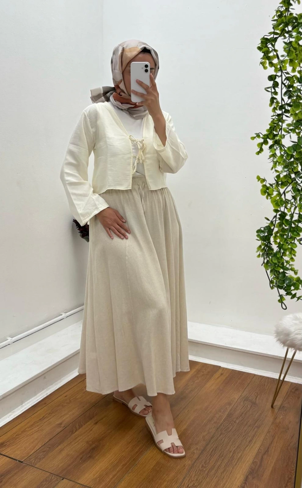 Doğal pamuklu kumaşıyla nefes alan bu bolero, hafif ve konforlu yapısıyla hem şıklık hem rahatlık sunar. Ön kısmındaki zarif bağlama detayı sayesinde sade kombinlere romantik bir dokunuş kazandırır.